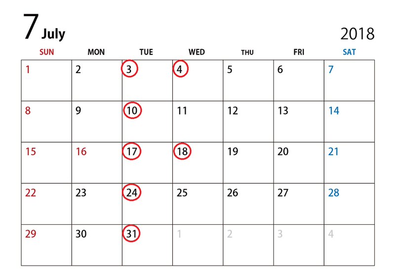 3日、4日、10日、17日、18日、24日、31日がお休みとなります。