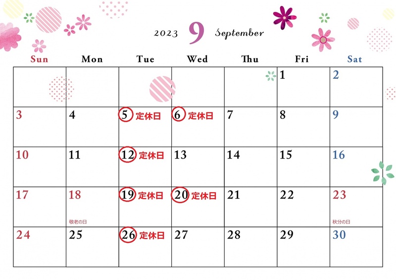 9月定休日は、
